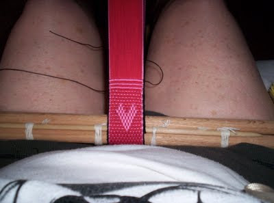 Then on a band this narrow I would usually just take two warps from the very center point, one from each shed, and tie another overhand knot. For demonstration purposes I have spaced them out like I would on a wider piece so you can see them.